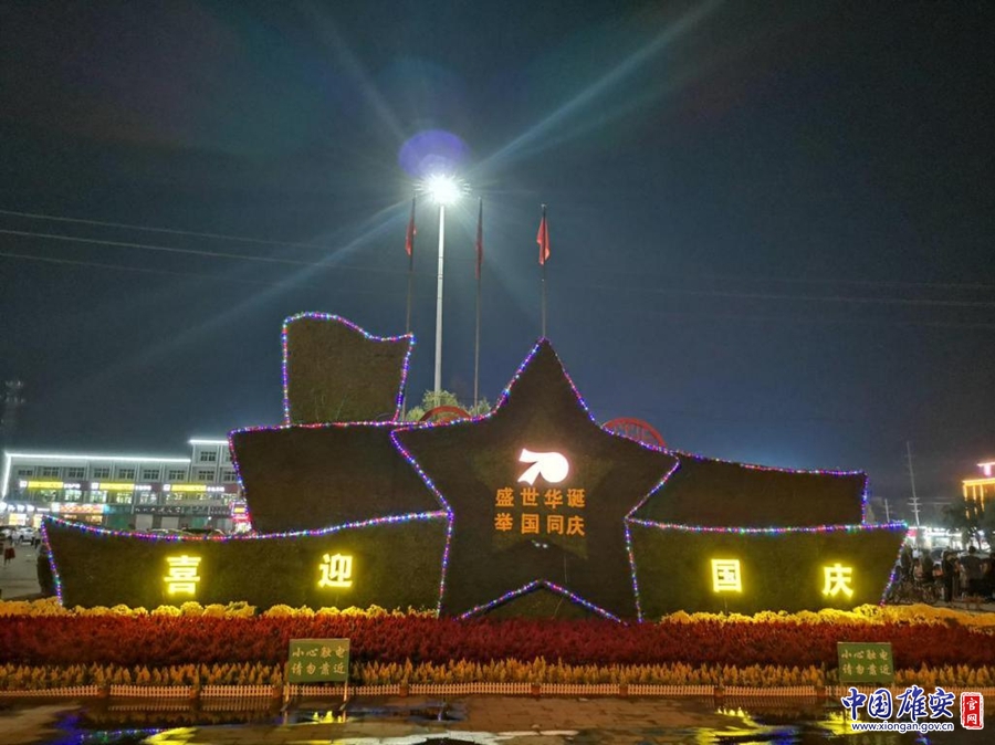 夜晚时分,雄安新区雄县庆祝新中国成立70周年主题花坛在灯光的映衬下格外引人注目。于杰 摄