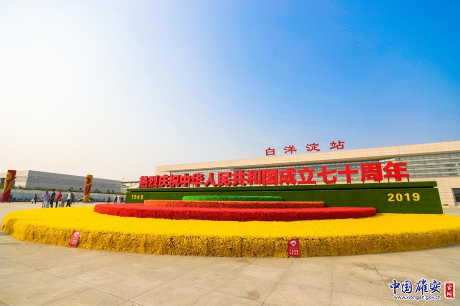 白洋淀站前布置的“热烈庆祝中华人民共和国成立七十周年”主题花坛,营造出浓厚、热烈的节日氛围。中国雄安官网记者王京卓 摄