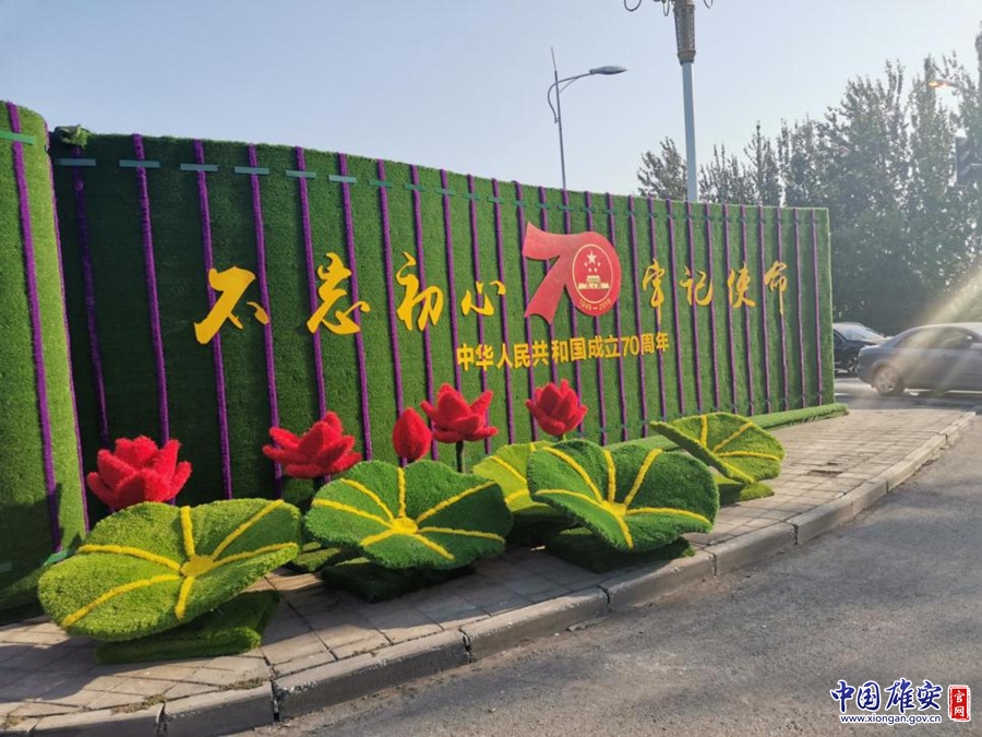 雄安新区安新县道路旁设置“不忘初心、牢记使命”主题景观,庆祝新中国成立70周年。中国雄安官网记者崔利杰 摄