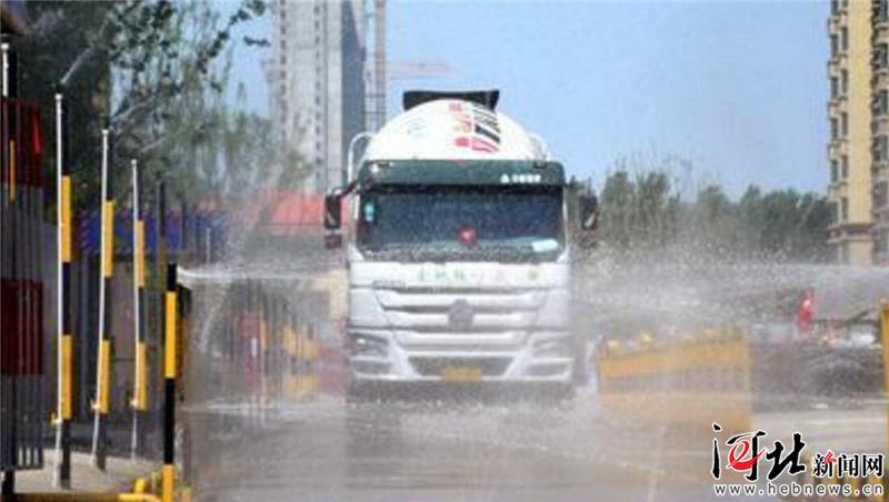 衡水市区某建筑工地内,一辆从工地驶出的车辆行驶到门口时,扬尘治理水泵立即喷出水来,将粘在车上的泥土冲洗得干干净净。记者焦磊 摄