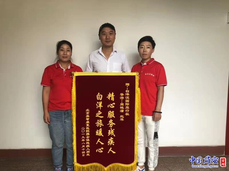 周艳蒲(右一)和赵琴(左一)接受旅行团送来的锦旗。雄安新区公共服务局供图