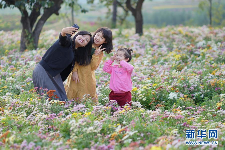 10月9日,游客在内丘县扁鹊药谷花海游玩。新华社记者朱旭东 摄