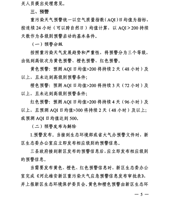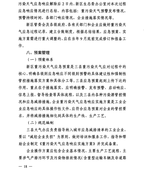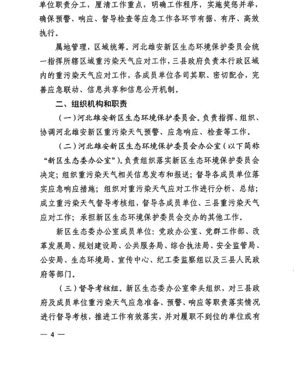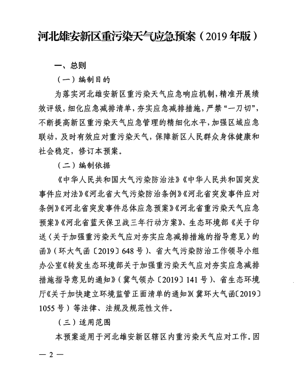 《河北雄安新区重污染天气应急预案(2019年版)》适用于河北雄安新区辖区内重污染天气应对工作。因沙尘和臭氧造成的重污染天气,不纳入重污染天气应急预案范畴。