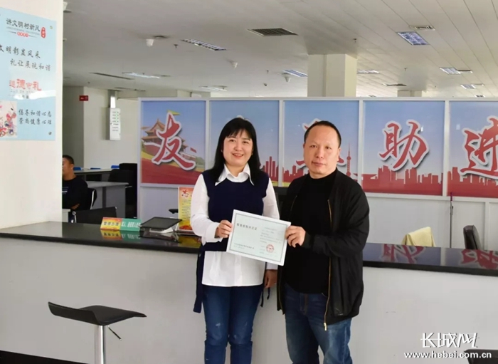 袁先生(右)展示自己拿到的许可证。资料图