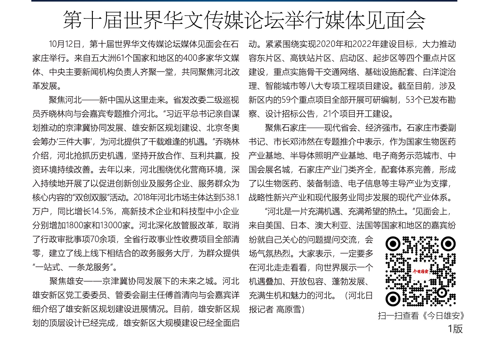 10月12日,第十届世界华文传媒论坛媒体见面会在石家庄举行。