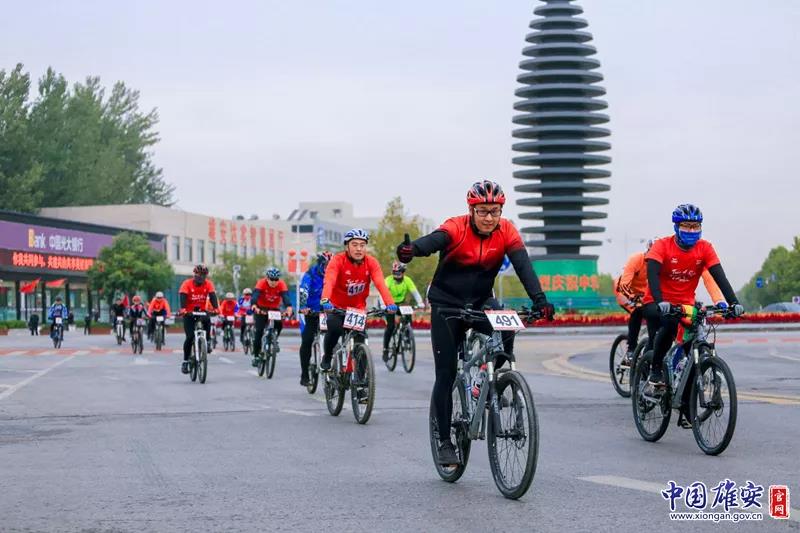 2019全民健身·雄安新区环白洋淀国际自行车赛现场,参赛选手面对镜头竖起大拇指。