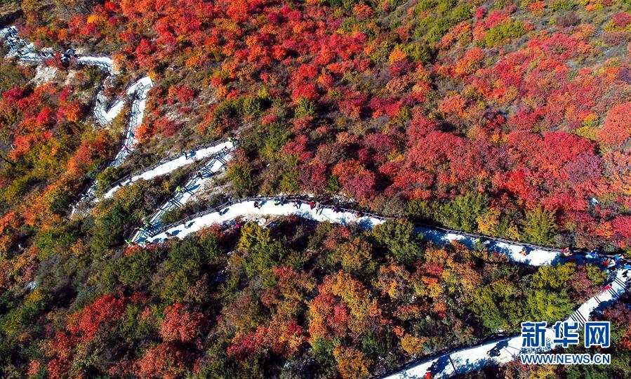 金秋十月,河北省涉县偏城镇太行红叶大峡谷的红叶进入观赏佳期,吸引众多游客前来登山赏景。新华社记者王晓 摄