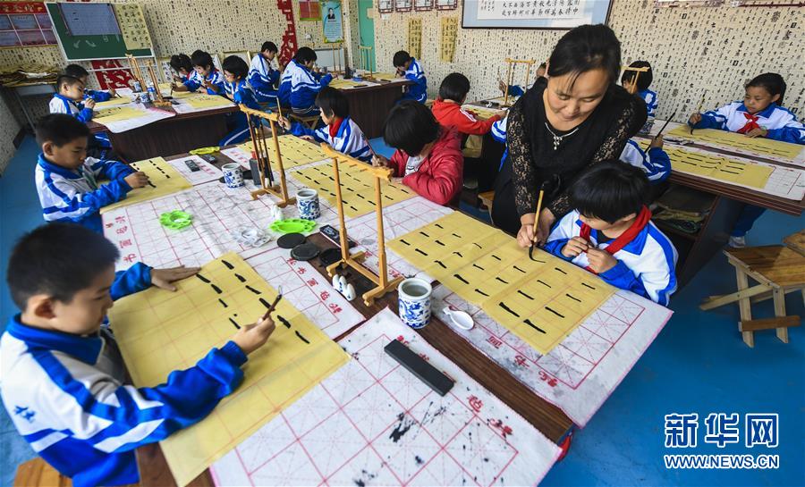 10月22日,河北省武强县北代学校书法社团的老师在指导孩子们练习书法。为进一步深化素质教育,挖掘学生的内在潜力,河北省武强县以社团活动为载体,在全县中小学组建武术、军乐队、经典诵读、摄影、书画、舞蹈、编织、足球等各种社团300余个,每周定期开展丰富多彩的社团活动,培养学生的兴趣和爱好,丰富学生的校园生活。新华社记者李晓果 摄