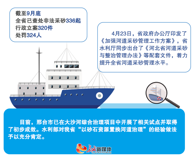 9.今年4月河北省开展打击河道非法采砂“飓风行动”以来,截至9月底,已查处非法采砂336起,行政立案320件,处罚324人,刑事立案多起,对不法分子形成有效震慑,维护了河道采砂正常秩序。
