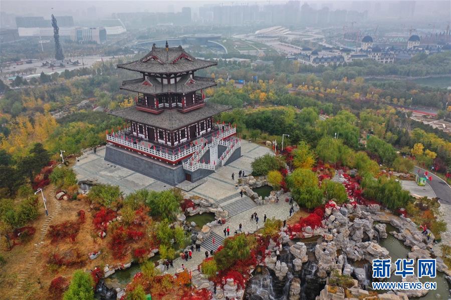 10月24日,游客在唐山市南湖景区游览(无人机拍摄)。河北省唐山市南湖景区是唐山市的“城市绿肺”,由开滦煤矿采煤沉降地经过综合治理建成。新华社记者邢广利 摄
