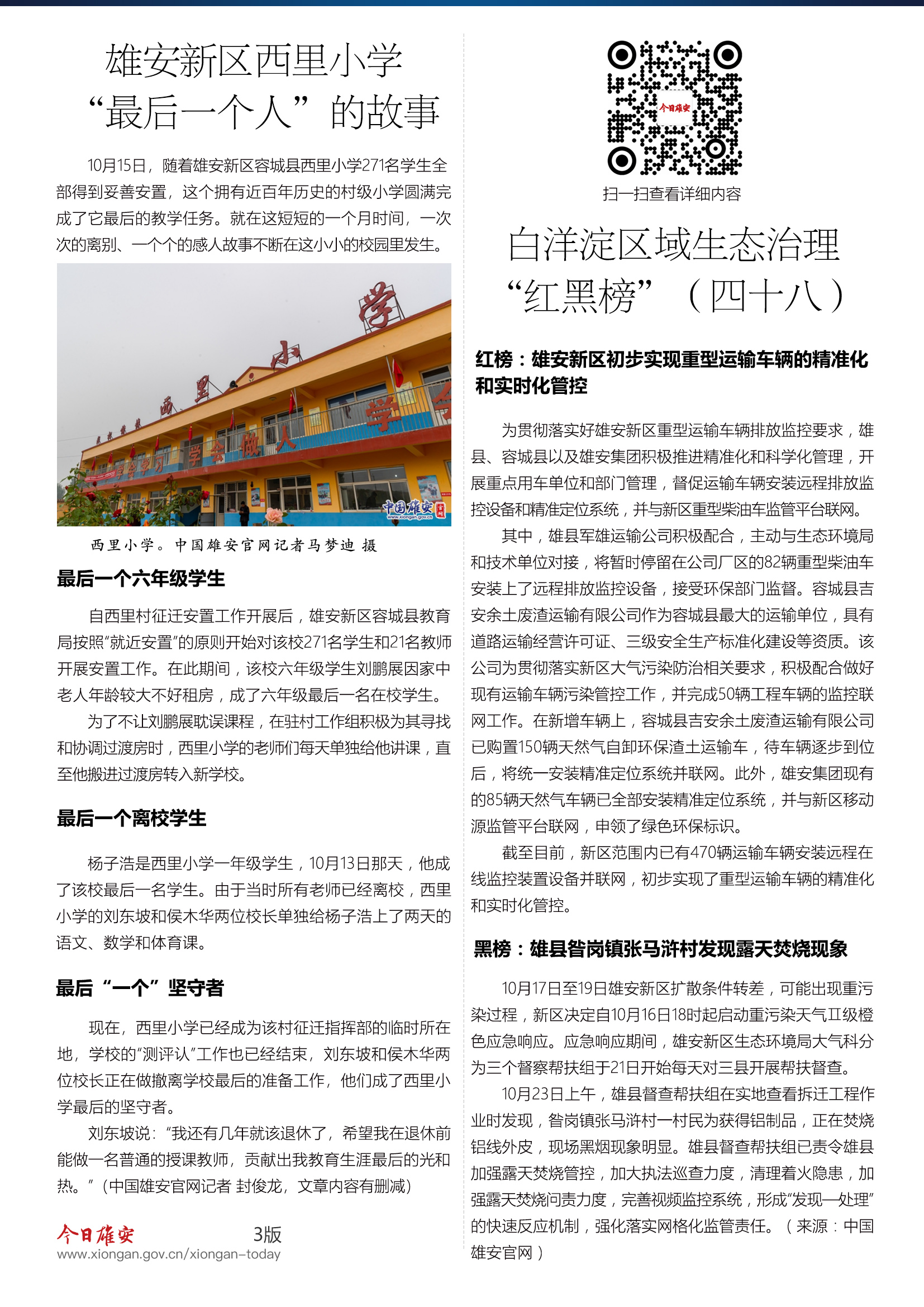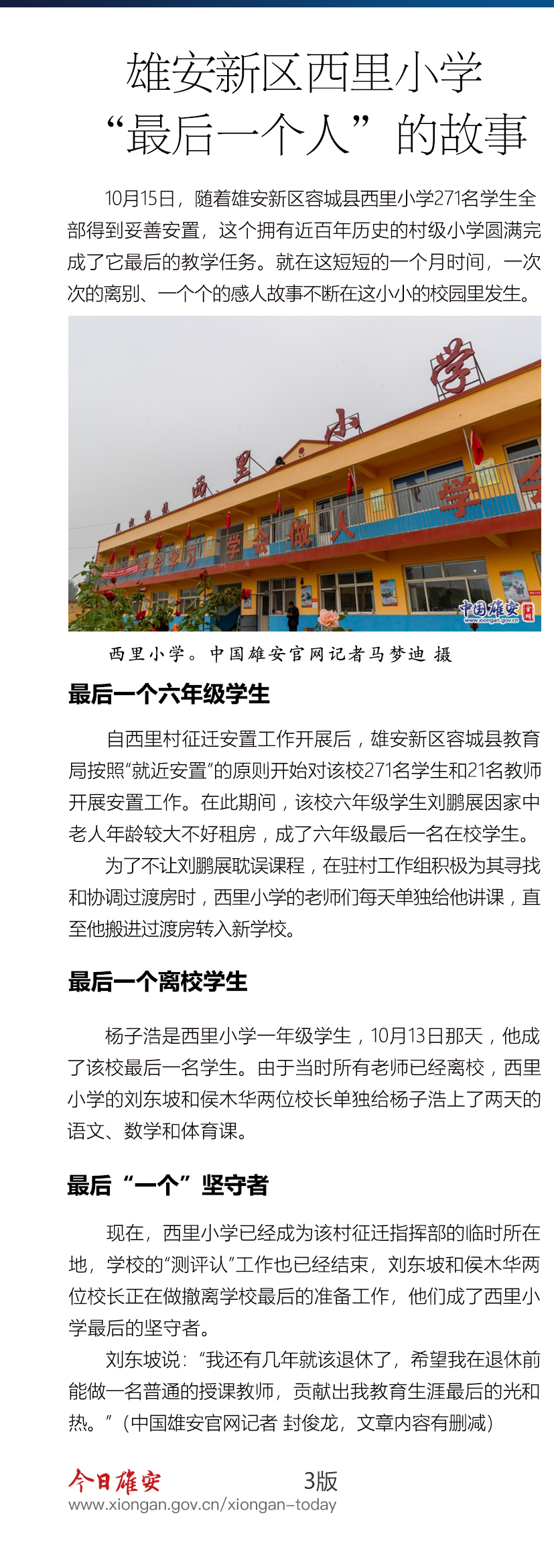 10月15日,随着雄安新区容城县西里小学271名学生全部得到妥善安置,这个拥有近百年历史的村级小学圆满完成了它最后的教学任务。