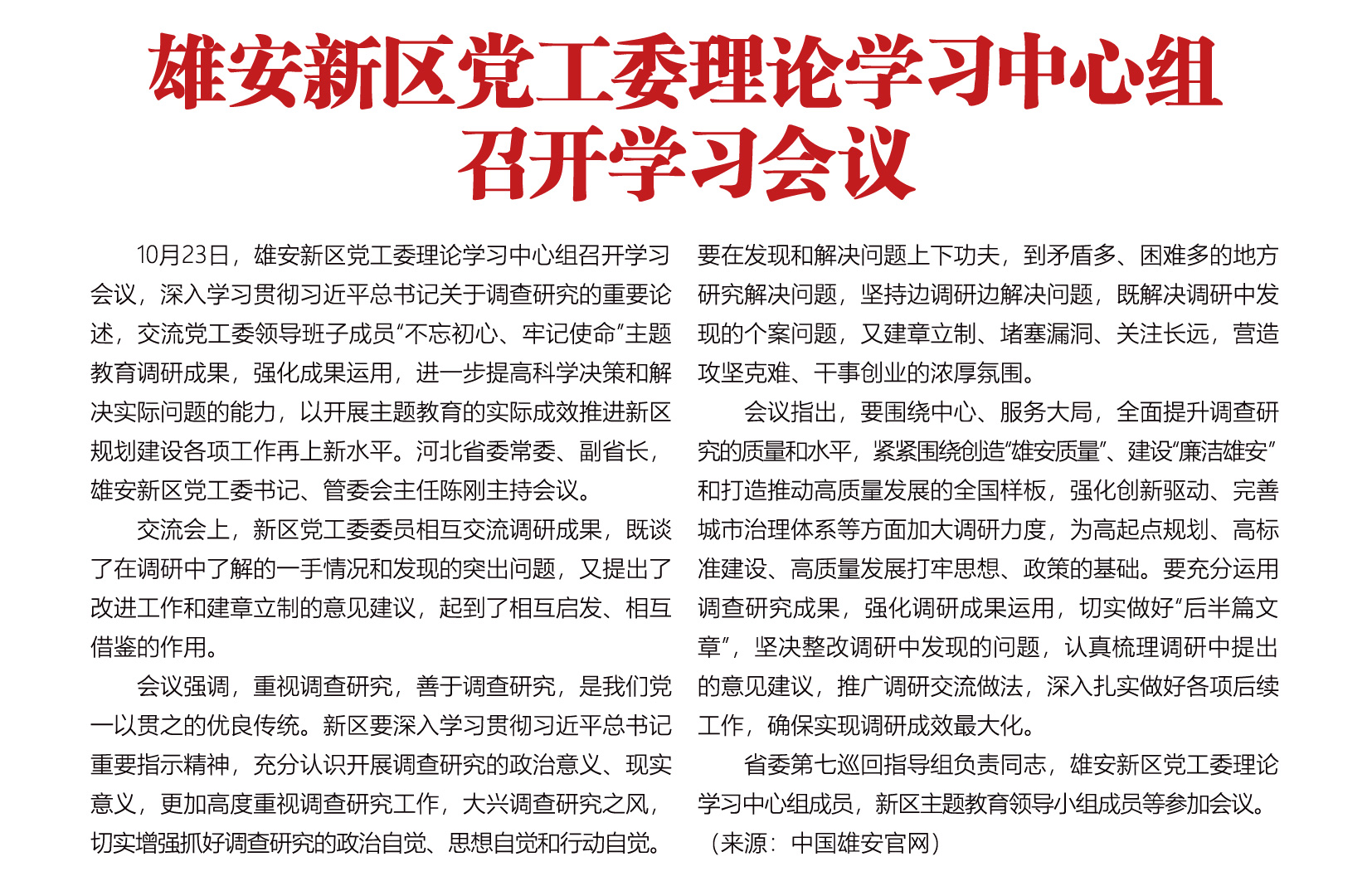 10月23日,雄安新区党工委理论学习中心组召开学习会议,交流党工委领导班子成员“不忘初心、牢记使命”主题教育调研成果,强化成果运用,进一步提高科学决策和解决实际问题的能力。