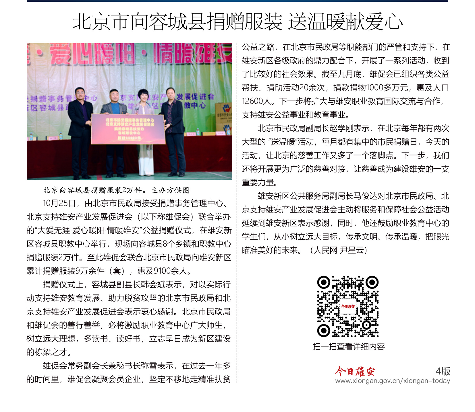 截至九月底,雄促会已组织各类公益帮扶、捐助活动20余次,捐款捐物1000多万元,惠及人口12600人。