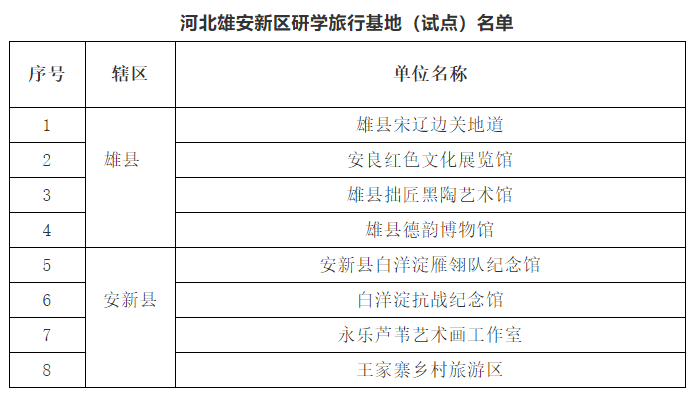 2.河北雄安新区拟将雄县宋辽边关地道等8家单位公布为河北雄安新区研学旅行基地(试点),公示时间为2019年10月29日-11月5日。