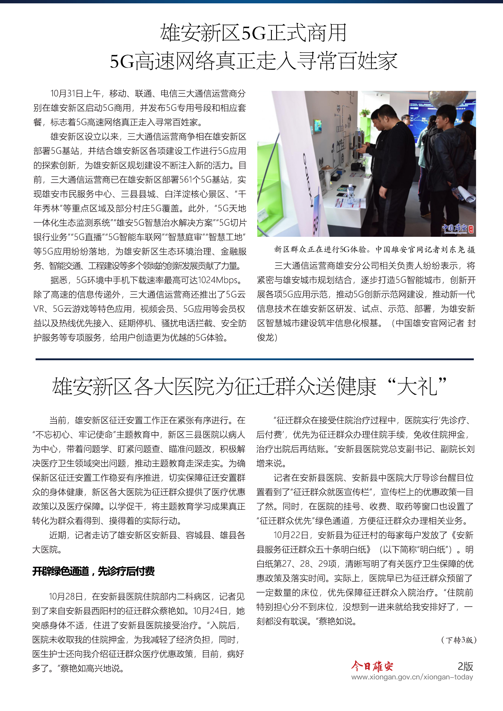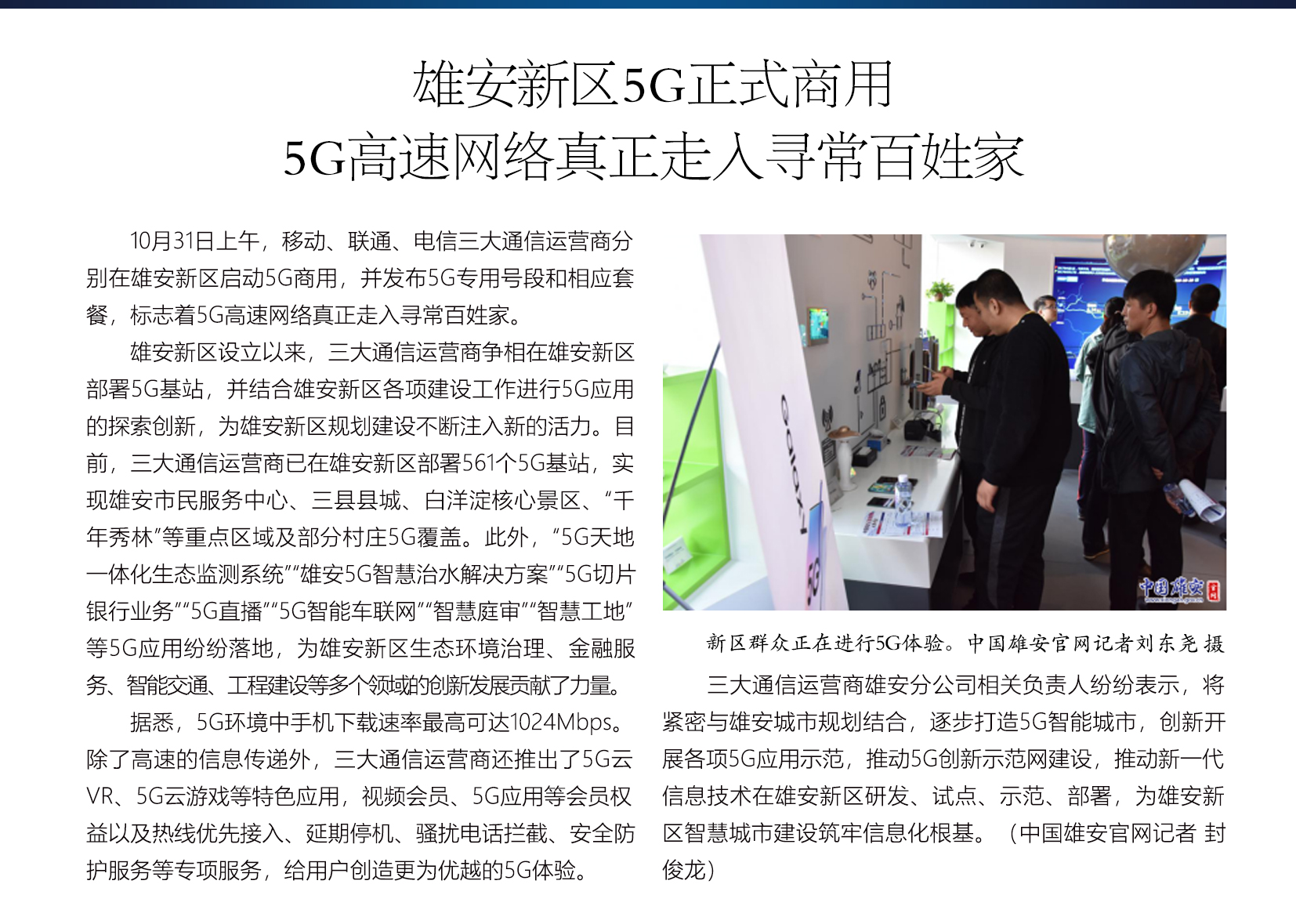 10月31日上午,移动、联通、电信三大通信运营商分别在雄安新区启动5G商用,并发布5G专用号段和相应套餐,标志着5G高速网络真正走入寻常百姓家。