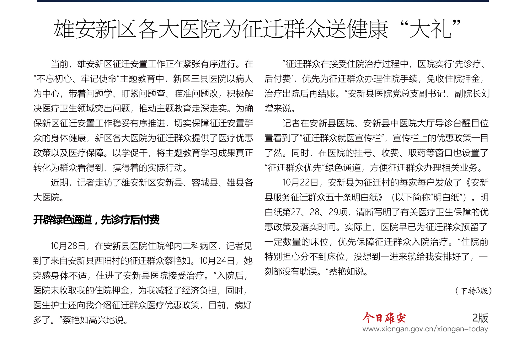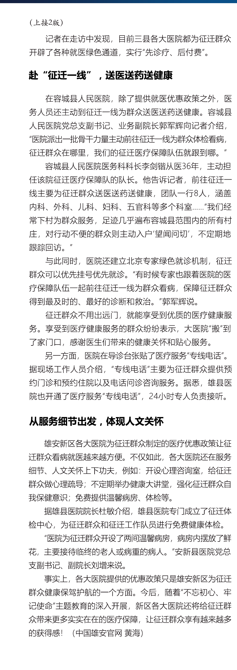 为确保新区征迁安置工作稳妥有序推进,切实保障征迁安置群众的身体健康,新区各大医院为征迁群众提供了医疗优惠政策以及医疗保障。