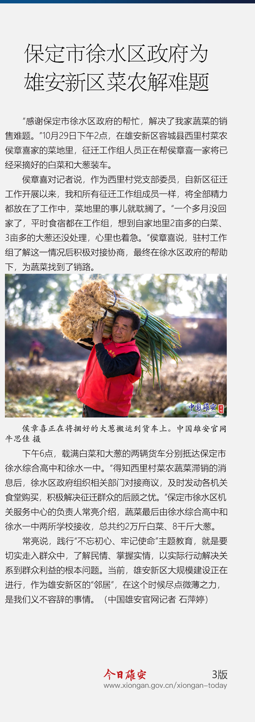 10月29日下午2点,在雄安新区容城县西里村菜农侯章喜家的菜地里,征迁工作组人员正在帮侯章喜一家将已经采摘好的白菜和大葱装车。
