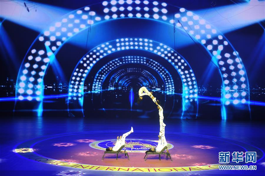 11月3日,来自埃塞俄比亚的演员在表演《蹬技》。 当日,第十七届中国吴桥国际杂技艺术节沧州会场世界杂技精品惠民展演在河北省沧州市体育馆举行。中国吴桥国际杂技艺术节创办于1987年,每两年举办一届,是我国杂技艺术领域举办历史最长、规模最大、影响最广的国家级艺术赛事和文化节庆活动。新华社记者牟宇 摄