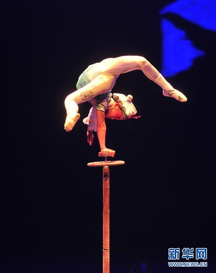 11月3日,河北省杂技团演艺有限公司演员在表演《“生丑炫技”——倒立》。 当日,第十七届中国吴桥国际杂技艺术节沧州会场世界杂技精品惠民展演在河北省沧州市体育馆举行。中国吴桥国际杂技艺术节创办于1987年,每两年举办一届,是我国杂技艺术领域举办历史最长、规模最大、影响最广的国家级艺术赛事和文化节庆活动。新华社记者牟宇 摄