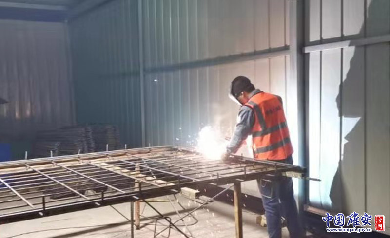 中铁上海工程局京雄城际铁路五标预制构件厂工人正在进行钢筋电焊。雄安新区生态环境局供图