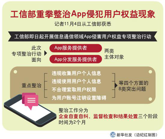 15.11月4日起,工信部开展信息通信领域App侵害用户权益专项整治行动,对违规收集用户个人信息、违规使用用户个人信息等8类突出问题重拳整治,时间为2个月。