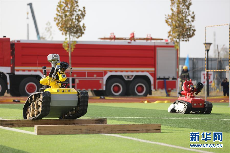 11月5日,在“消防宣传月”启动仪式上,消防机器人在进行消防救援演练。当日,河北省衡水市消防支队举行“119消防宣传月”启动仪式,演练内容包括火场灭火、障碍救援等。新华社记者 朱旭东 摄