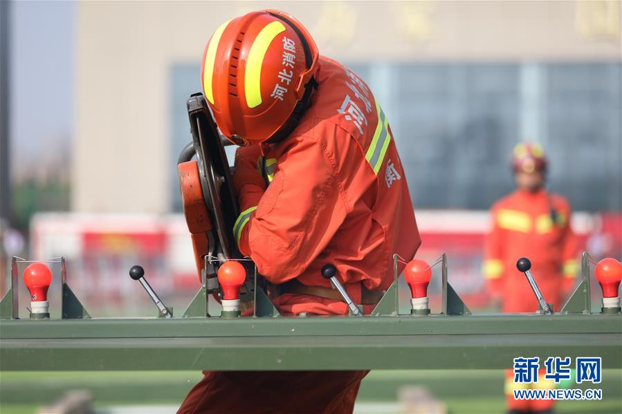 11月5日,在“消防宣传月”启动仪式上,消防人员在进行消防技能演练。当日,河北省衡水市消防支队举行“119消防宣传月”启动仪式,演练内容包括火场灭火、障碍救援等。新华社记者 朱旭东 摄