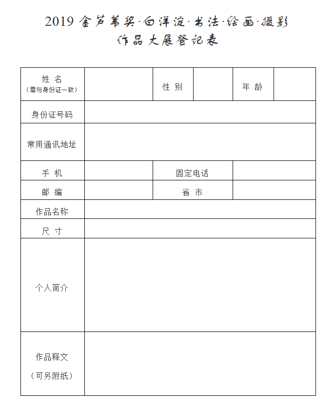附件:2019金芦苇奖·白洋淀·书法·绘画·摄影作品大展登记表