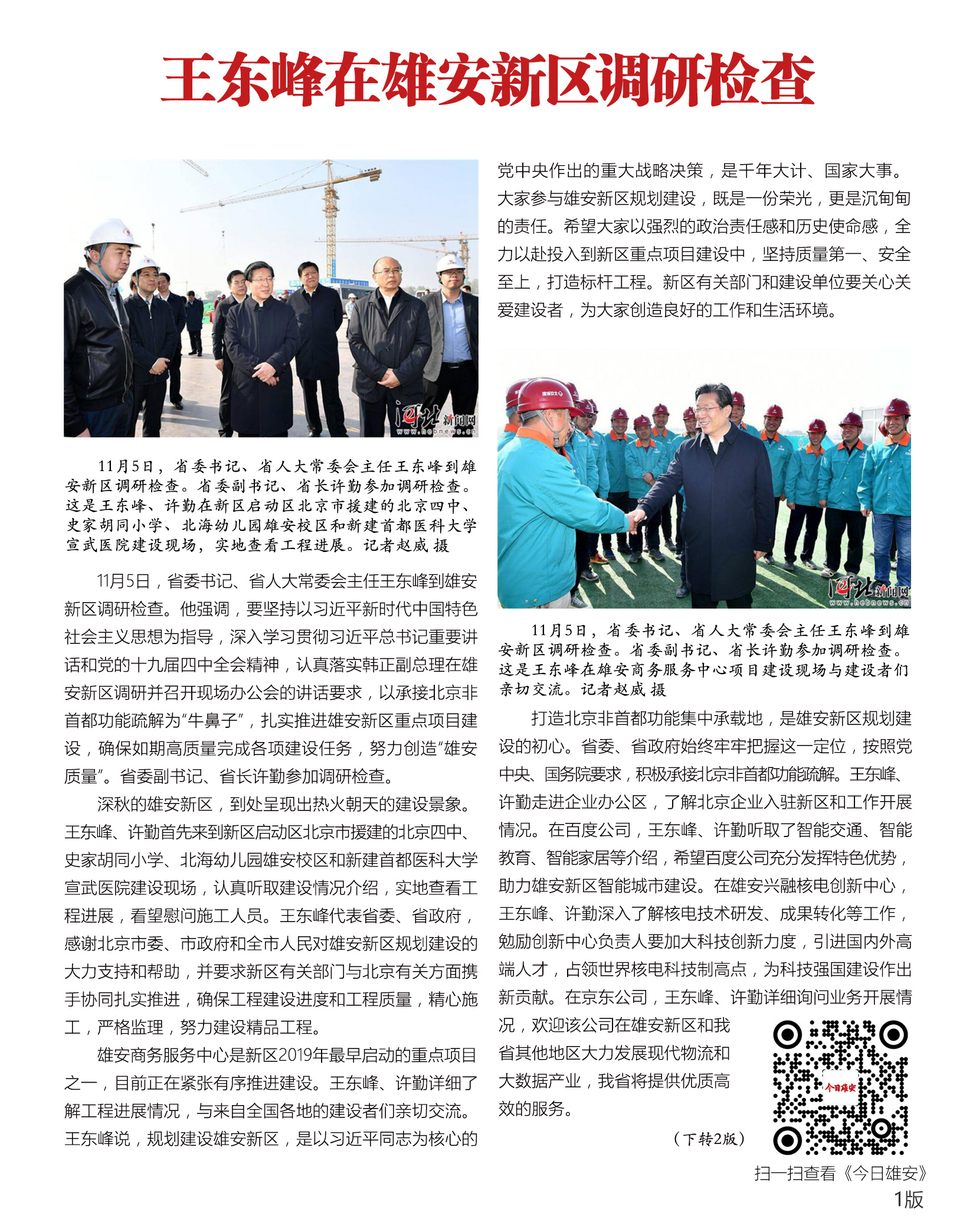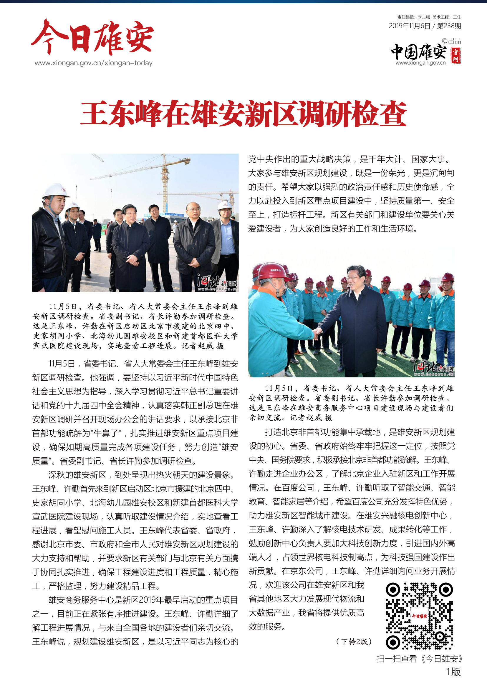 11月5日,河北省委书记、省人大常委会主任王东峰到雄安新区调研检查。