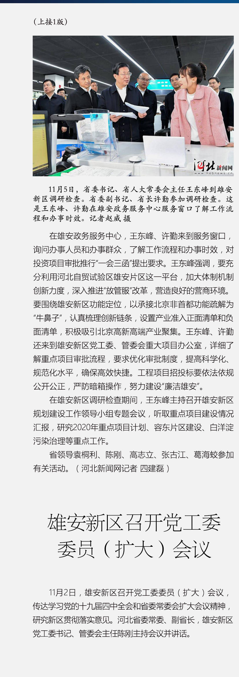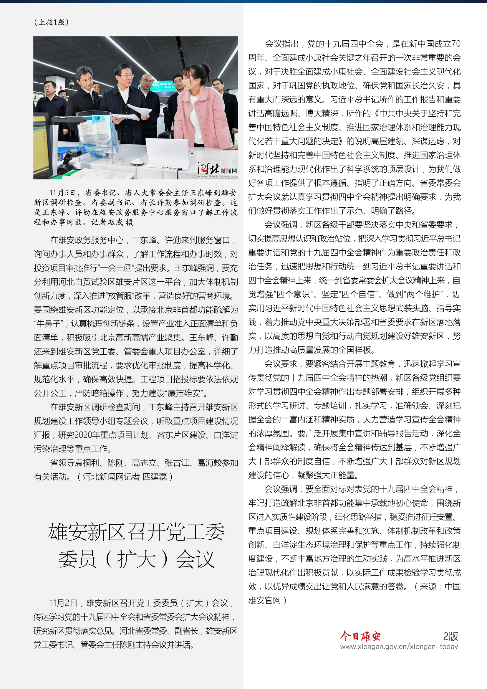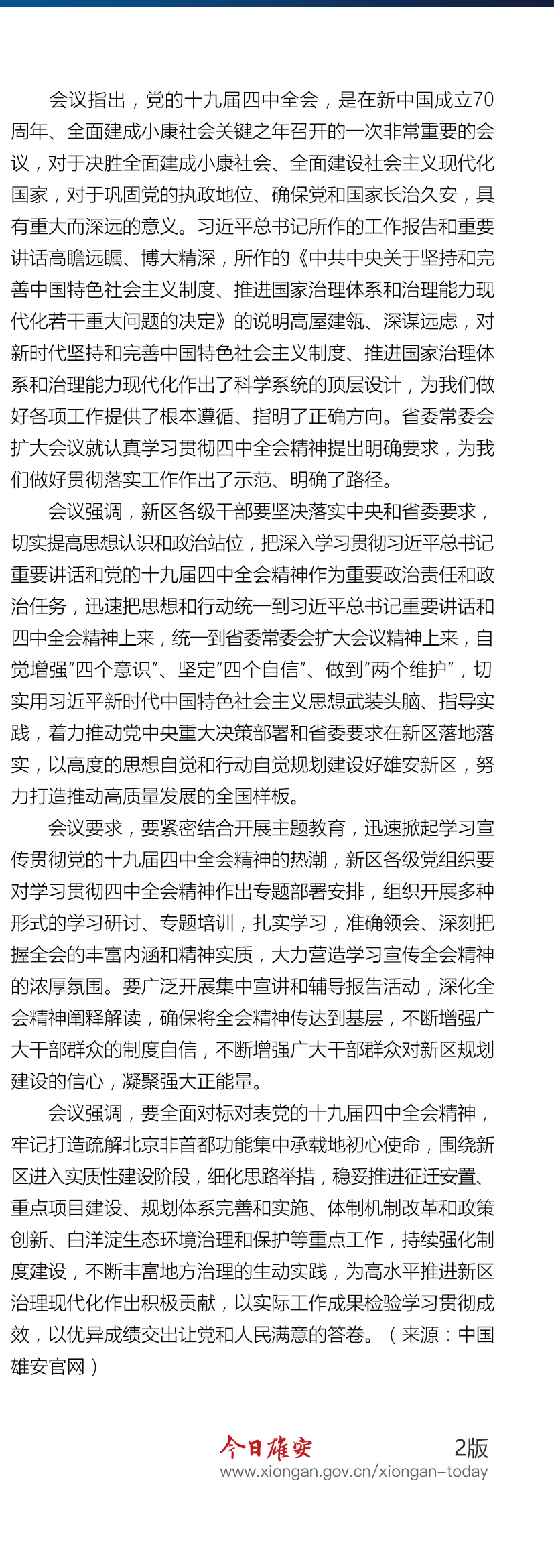 11月2日,雄安新区召开党工委委员(扩大)会议,传达学习党的十九届四中全会和省委常委会扩大会议精神,研究新区贯彻落实意见。