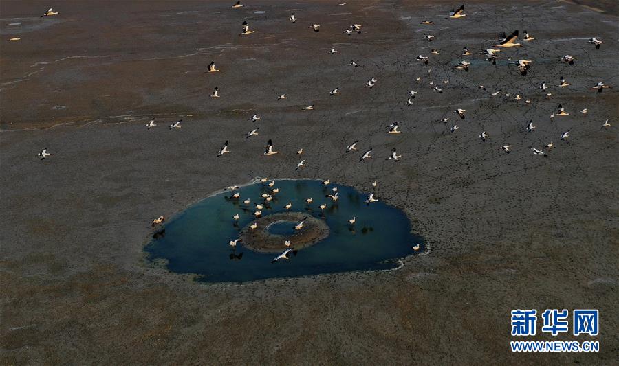 11月5日,一群东方白鹳在曹妃甸湿地飞舞(无人机拍摄)。