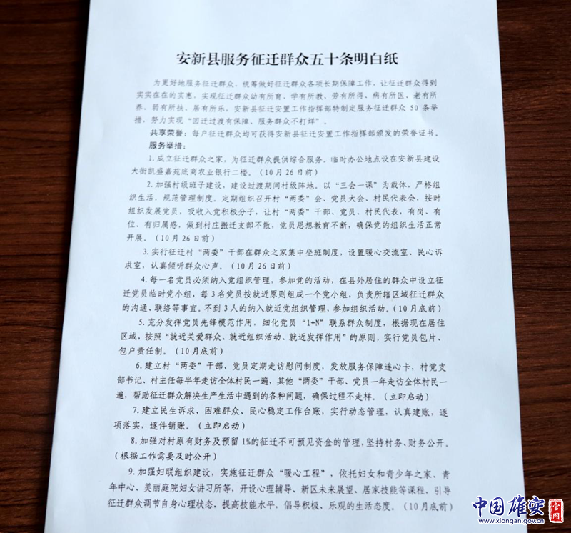“‘明白纸’上的五十条政策,并不是纸上文字,而是实实在在的保障举措。目前,这五十条政策已经设置了时间节点,分步骤、分阶段完成。”安新县端村镇干部、征迁工作队员田红军说。