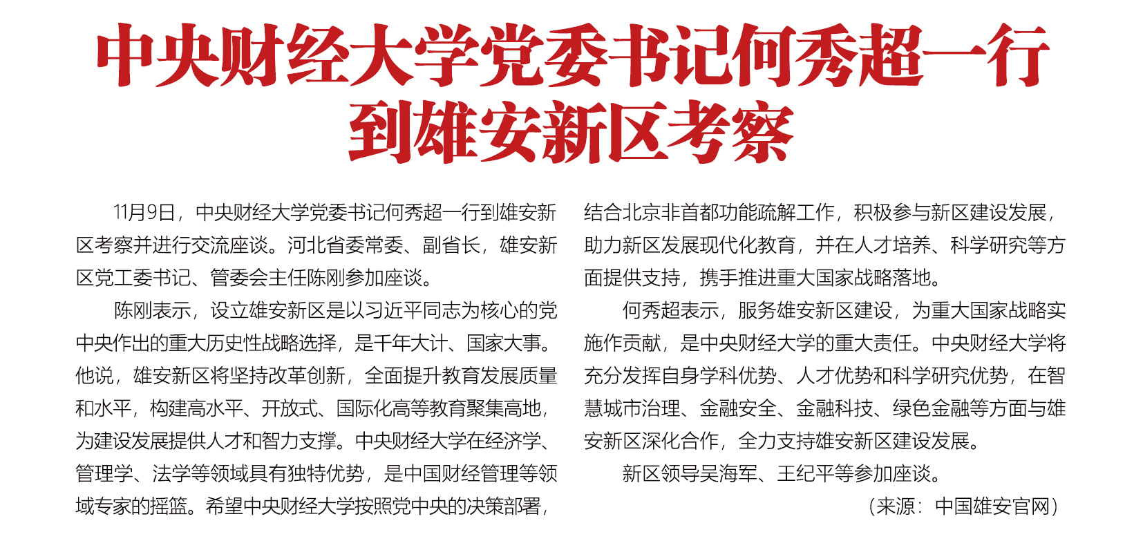 11月9日,中央财经大学党委书记何秀超一行到雄安新区考察并进行交流座谈。