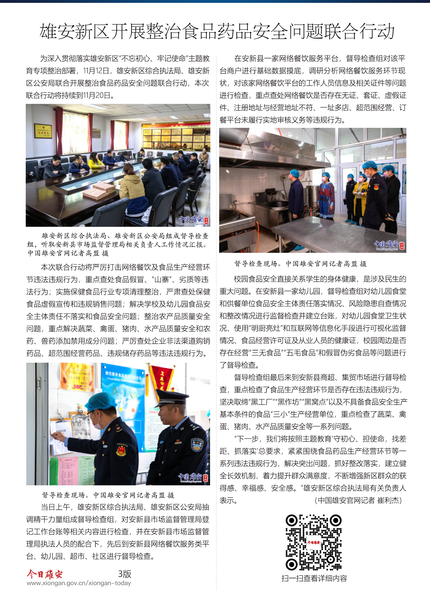 11月12日,雄安新区综合执法局、雄安新区公安局联合开展整治食品药品安全问题联合行动,本次联合行动将持续到11月20日。
