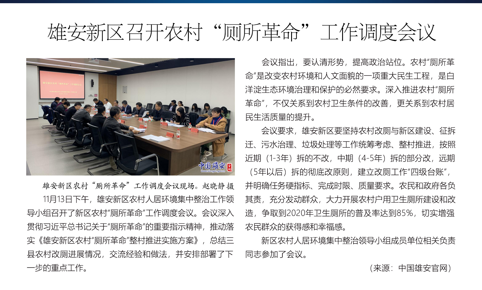 11月13日下午,雄安新区农村人居环境集中整治工作领导小组召开了新区农村“厕所革命”工作调度会议。