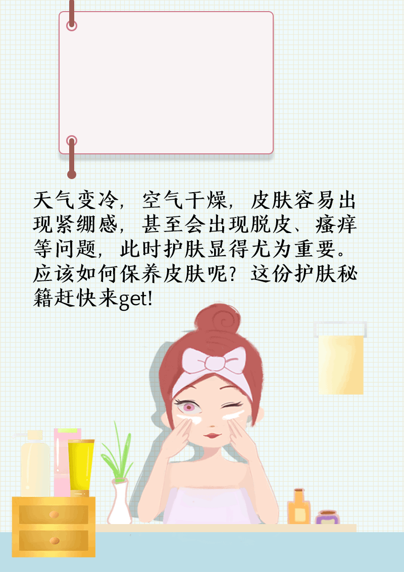 天气变冷,空气干燥,皮肤容易出现紧绷感,甚至会出现脱皮、瘙痒等问题,此时护肤显得尤为重要。应该如何保养皮肤呢?这份护肤秘籍赶快来get!