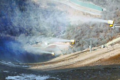 11月15日,造雪机和压雪车已准备就绪,放置在伸缩杆上、黄白相间的6台造雪机同时喷射出美丽的水雾。工作人员介绍,待温度条件成熟后,水雾将在空中迅速凝结为雪从天而降。