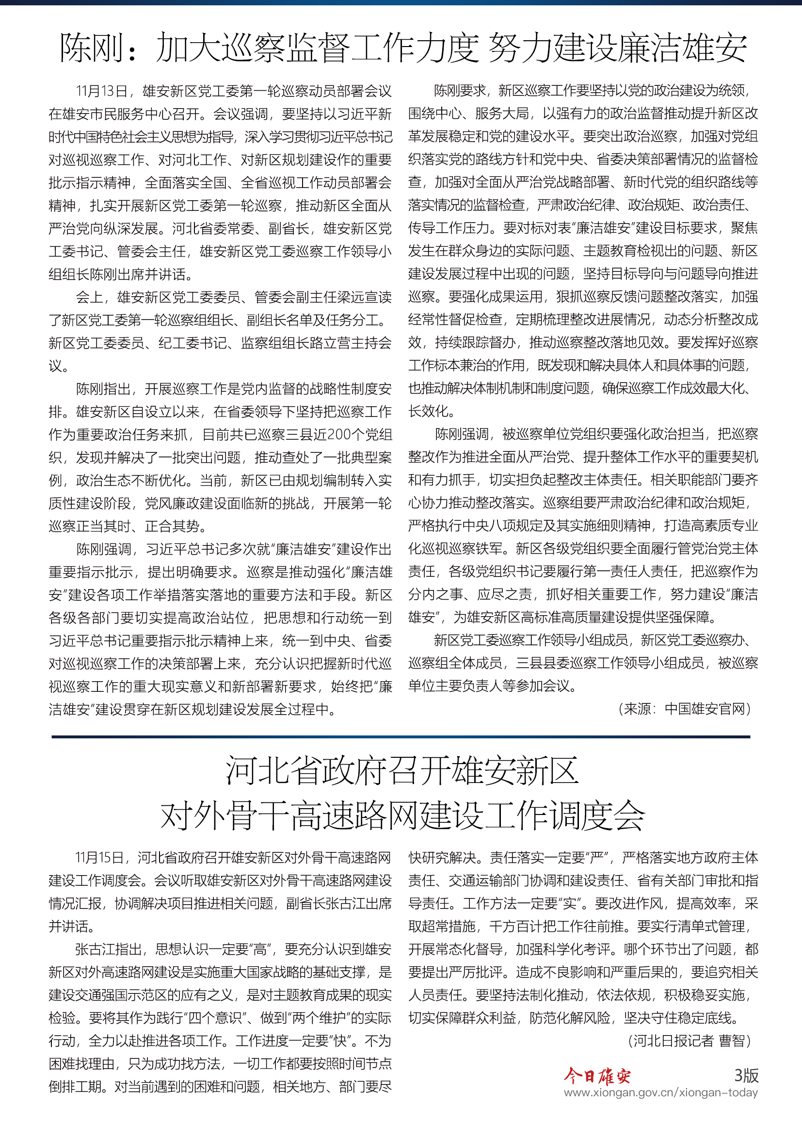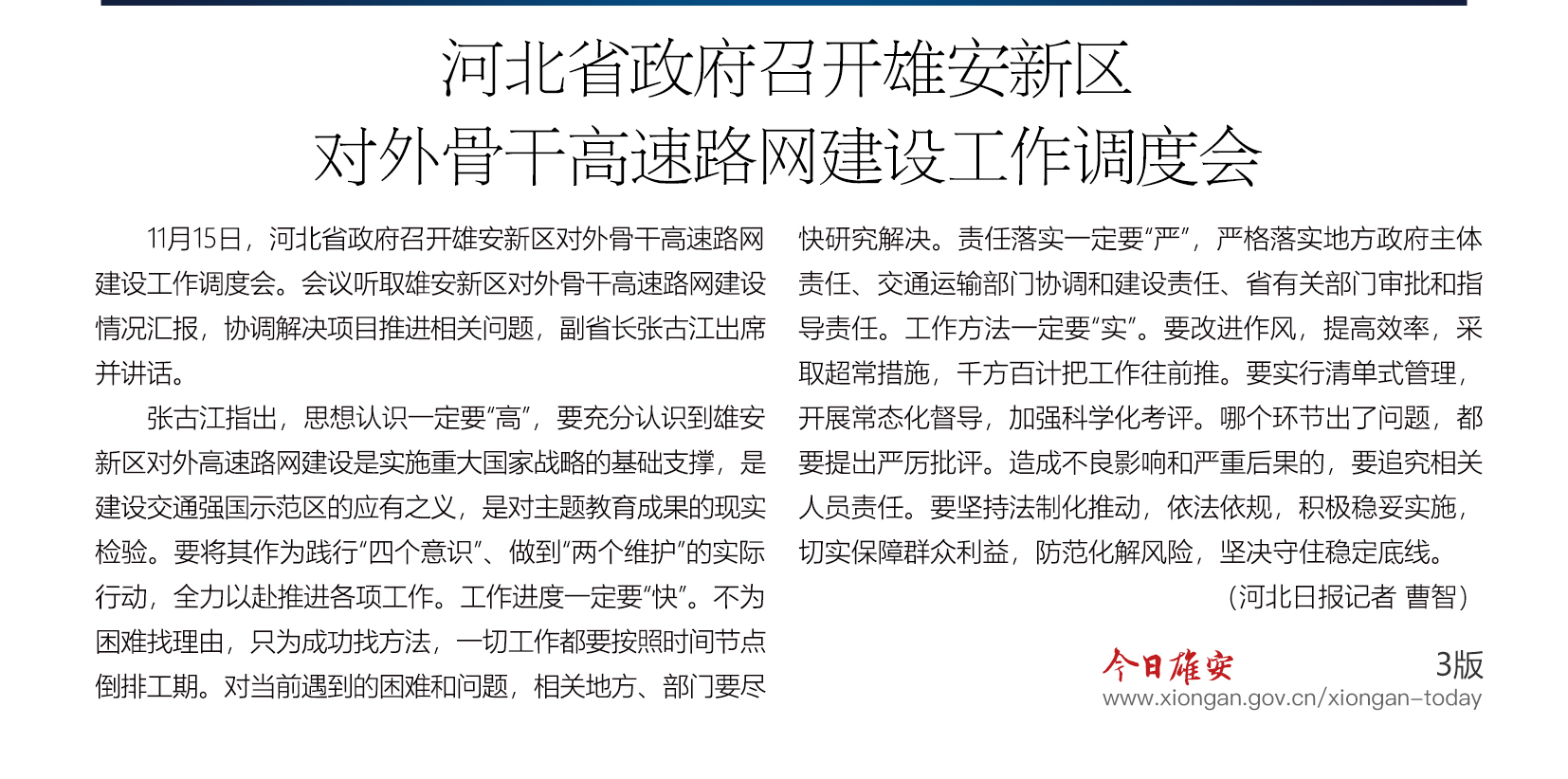 11月15日,河北省政府召开雄安新区对外骨干高速路网建设工作调度会。会议听取雄安新区对外骨干高速路网建设情况汇报,协调解决项目推进相关问题,副省长张古江出席并讲话。