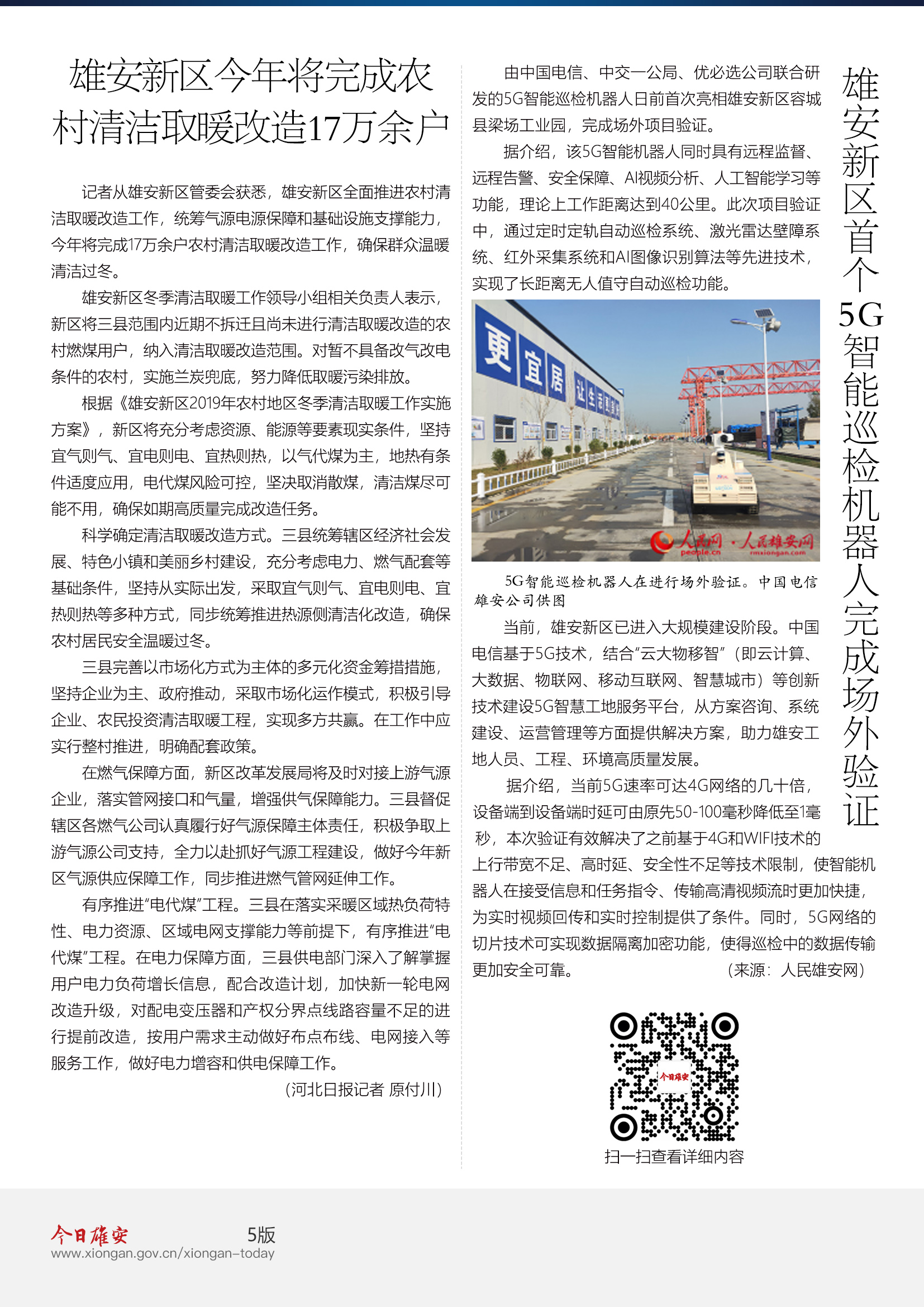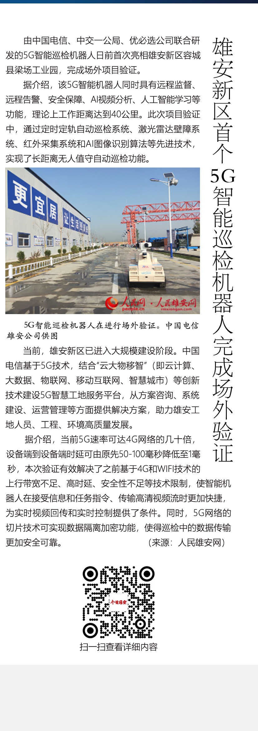 由中国电信、中交一公局、优必选公司联合研发的5G智能巡检机器人日前首次亮相雄安新区容城县梁场工业园,完成场外项目验证。
