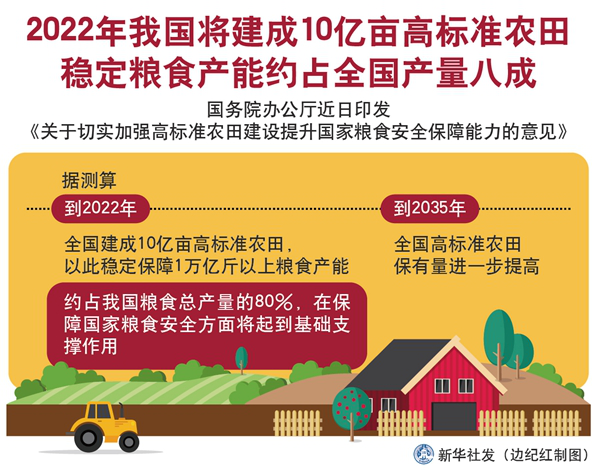 13.国务院办公厅近日印发《关于切实加强高标准农田建设提升国家粮食安全保障能力的意见》,提出到2022年全国建成10亿亩高标准农田,以此稳定保障1万亿斤以上粮食产能。