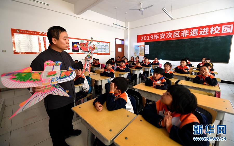 11月27日,安次区第什里风筝艺人在为廊坊市第十七小学学生介绍风筝知识。当日,河北省廊坊市第十七小学开展“非遗进校园”主题活动,邀请民间非遗传承人走进校园,展示非遗技艺。近年来,廊坊市安次区在中小学、幼儿园开设非遗课程,培养学生对传统文化的兴趣。新华社记者 王晓 摄