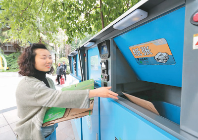 垃圾分类是创建绿色社区的重点。图为重庆市沙坪坝区覃家岗街道新鸣社区居民把可回收垃圾放进社区立德智能垃圾分类回收设备。孙凯芳 摄