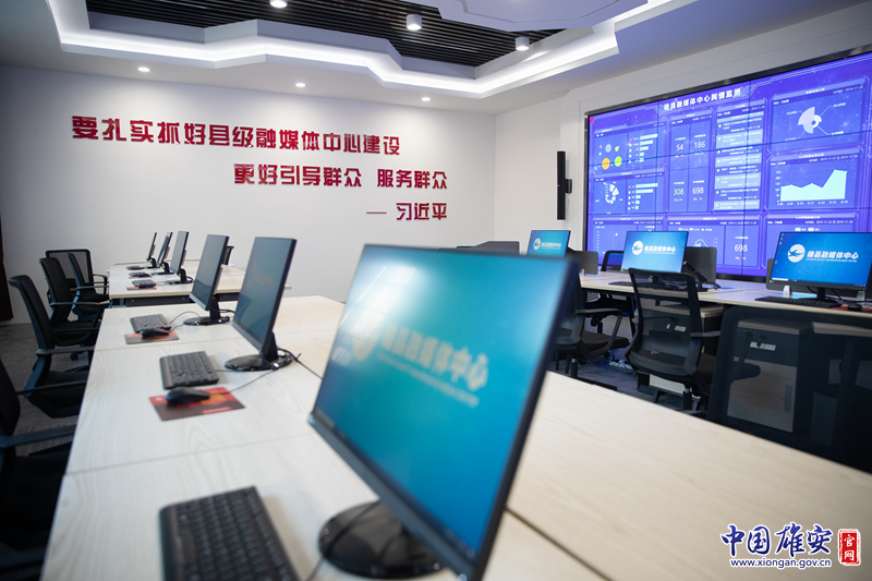 雄县融媒体中心由雄县广播电视台与新华网股份有限公司共同建设,包括指挥中心、多功能演播厅和办公区三大功能区域,图为雄县融媒体中心指挥中心。中国雄安官网记者刘东尧 摄