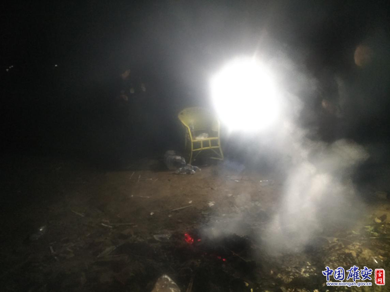 11月21日晚,雄安新区生态环境局执法支队与容城县生态环境局、容城县公安局联合行动,对容城县各拆迁工地落实重污染天气应急响应措施情况开展夜查。检查发现,在丰宁满族自治县卓安建筑工程有限公司负责的大河镇胡村拆迁工地上,两名负责看守现场的人员正在露天焚烧垃圾、塑料等杂物取暖,产生大量有害气体,空气污染严重。
