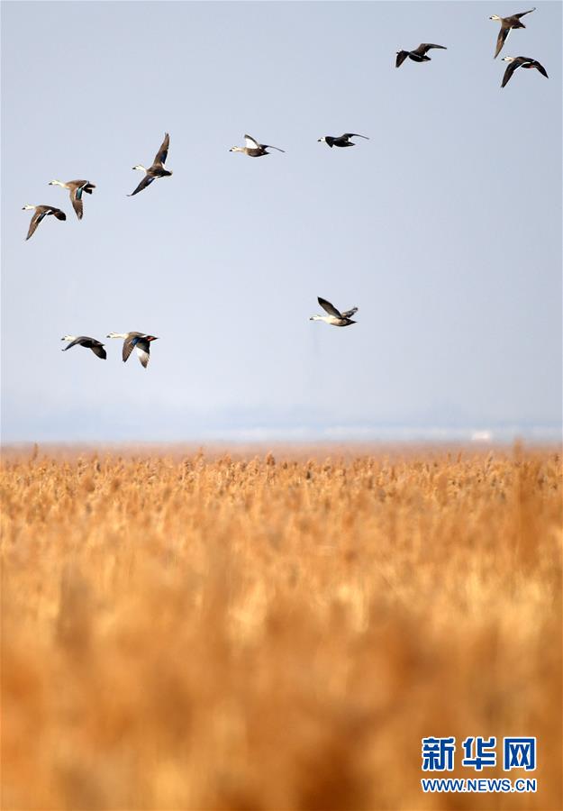 12月3日,一群候鸟在天津北大港湿地自然保护区上空飞翔。近日,天津北大港湿地自然保护区迎来大批到此栖息的候鸟。新华社记者李然 摄
