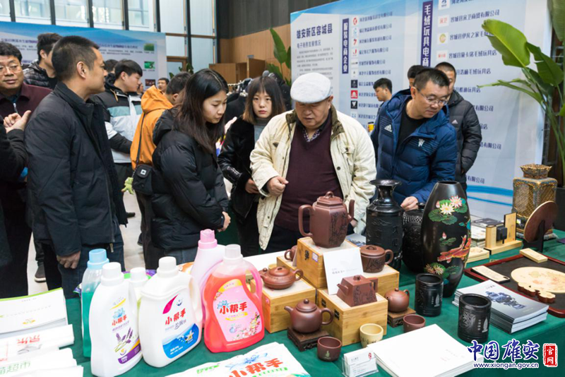 与此同时,雄安新区三县电子商务发展成果展在会场外举行,雄州黑陶、芦苇画、京簧竹刻、荷叶茶等产品亮相成果展,吸引了与会嘉宾和企业代表纷纷驻足观看交流。