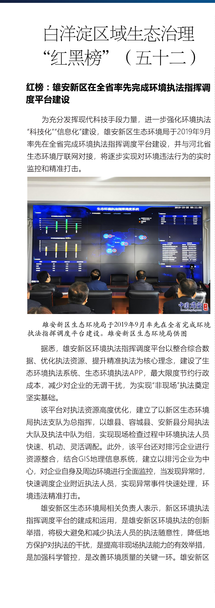 今年9月,雄安新区在河北省率先完成环境执法指挥调度平台建设,并与省生态环境厅联网对接。