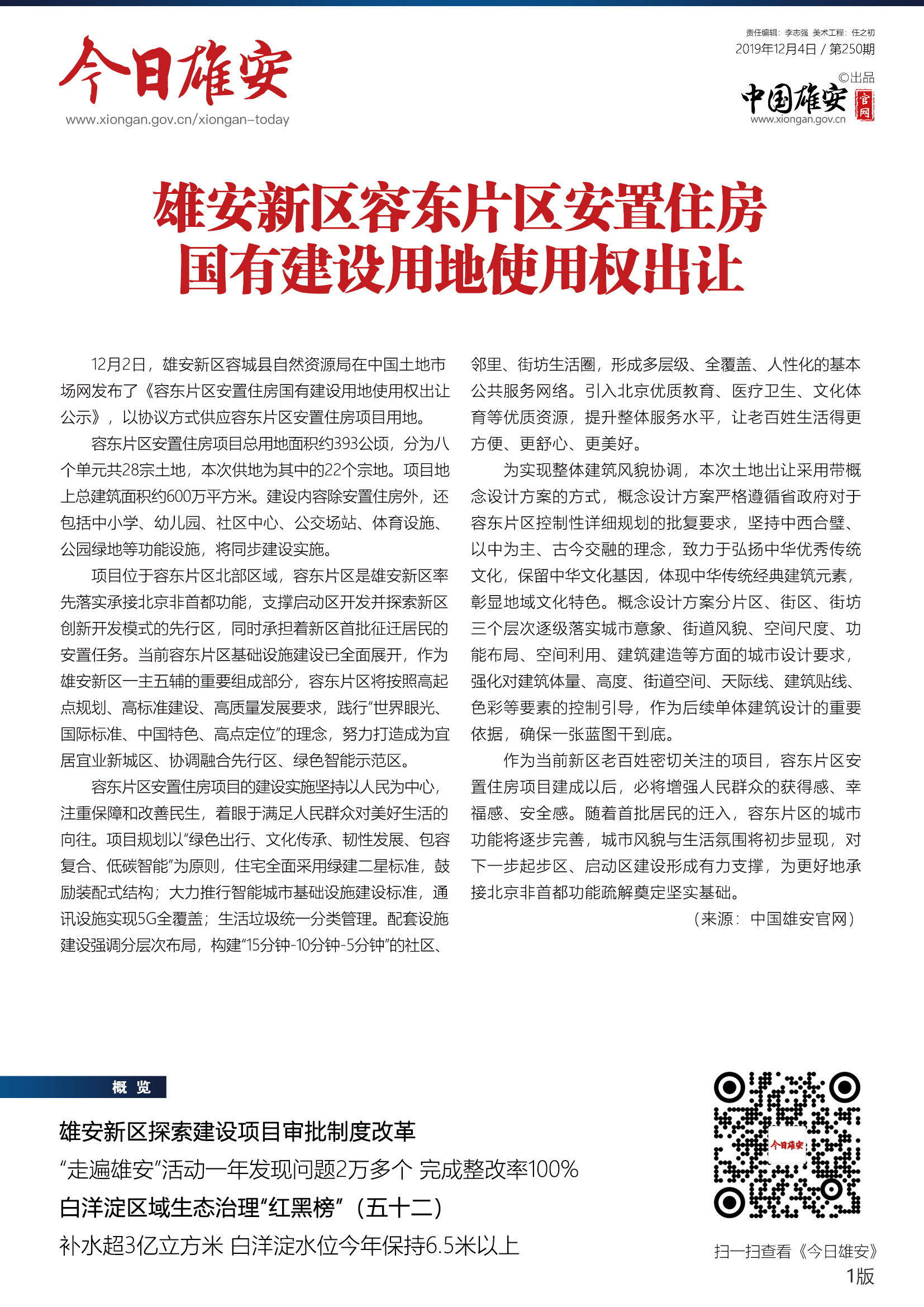 12月2日,雄安新区容城县自然资源局在中国土地市场网发布了《容东片区安置住房国有建设用地使用权出让公示》,以协议方式供应容东片区安置住房项目用地。