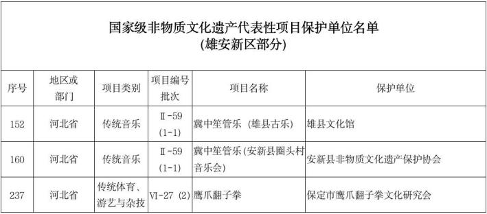 5.文化和旅游部办公厅日前公布调整后的国家级非物质文化遗产代表性项目保护单位名单,雄安新区雄县文化馆、安新县非物质文化遗产保护协会、保定市鹰爪翻子拳文化研究会三单位入选。