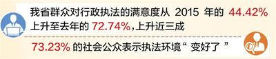 执法人员主动出示或佩带执法证件已成习惯、行政执法行为不断规范、行政执法透明度不断提高……由省司法厅组织的第三方评估显示,我省群众对行政执法的满意度从2015年的44.42%上升至去年的72.74%,上升近三成,73.23%的社会公众表示执法环境“变好了”。